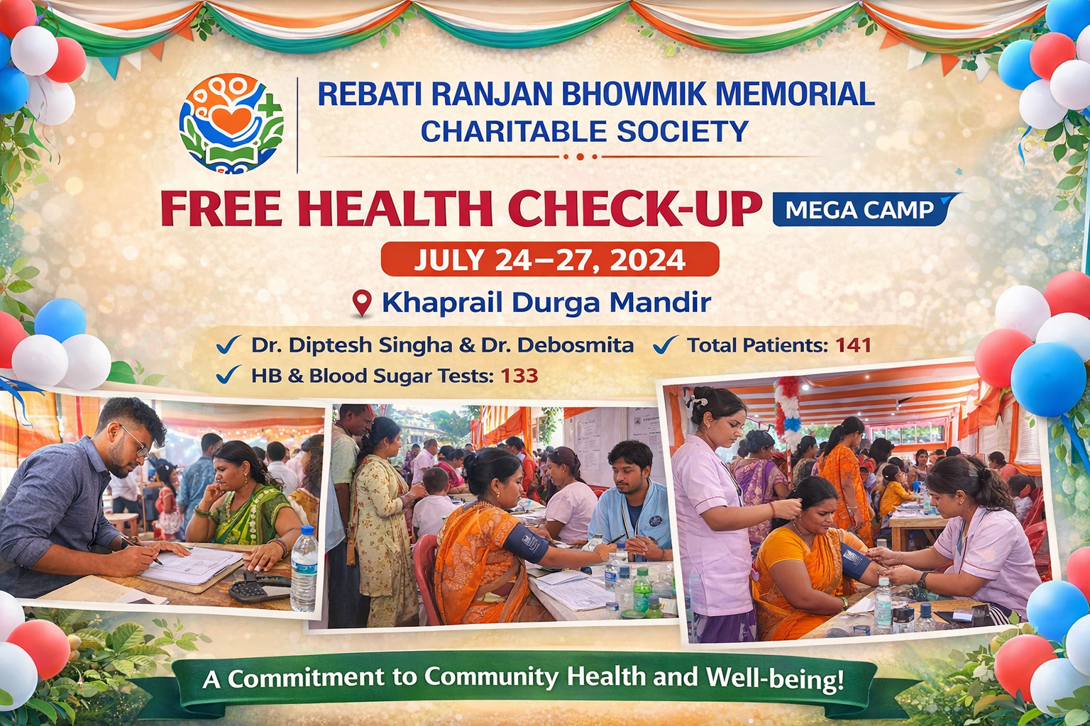 The Free Health Check-up Mega Camp, organized by the Rebati Ranjan Bhowmik Memorial Charitable Society, was successfully conducted from 24 July to 27 July at Khaprail Durga Mandir with the objective of providing accessible healthcare services to the local community. The camp was led by Dr. Diptesh Singha and Dr. Debosmita, who offered their professional