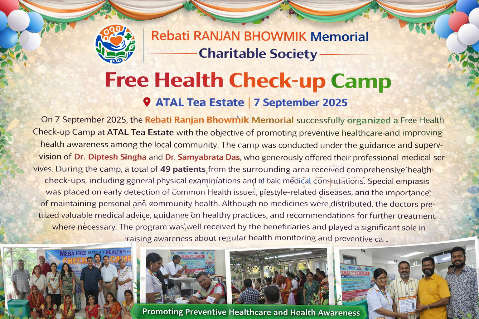 On 7 September 2025, the Rebati Ranjan Bhowmik Memorial successfully organized a Free Health Check-up Camp at ATAL Tea Estate with the objective of promoting preventive healthcare and improving health awareness among the local community. The camp was conducted under the guidance and supervision of Dr. Diptesh Singha and Dr. Samyabrata Das, who generously offered