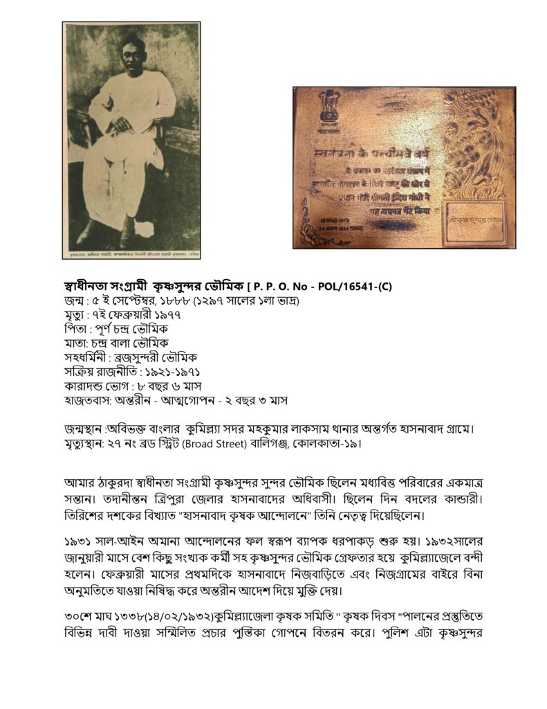 Freedom Fighter Krishnasundar Bhowmik (PPO No. POL/16541-C)