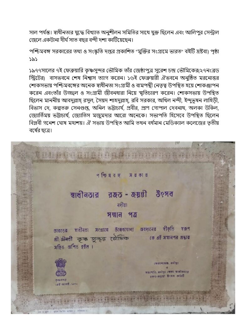 The government of West Bengal awarded him a certificate of honor during the “Blood and Sacrifice Festival of Independence” in Nadia.